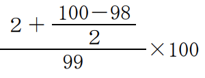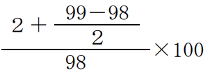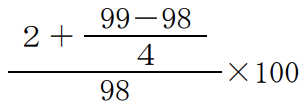 表面利率(クーポンレート)2%、残存期間4年の固定利付債券を、額面100円当たり98円で購入し、2年後に額面100円当たり99円で売却した場合の所有期間利回り(単利)を算出する計算式は、( )である。なお、税金や手数料等は考慮しないものとする。