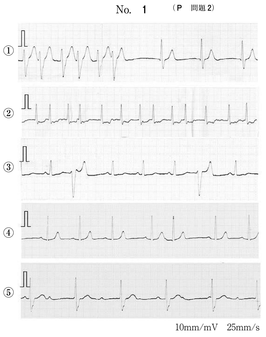 トップ 医療・介護・福祉に関する資格 理学療法士 平成30年度 第53回 過去問(2018年度) 問2 全部で199問 挑戦中 午前 問題 心電図(別冊No.1①〜⑤)を別に示す。 心電図と所見の組合せで正しいのはどれか。2つ選べ。 (1) ① ー 心房細動 ② ー 洞性徐脈 ③ ー 心室性期外収縮 ④ ー 心房性期外収縮 ⑤ ー 発作性上室性頻拍 次の問題へ