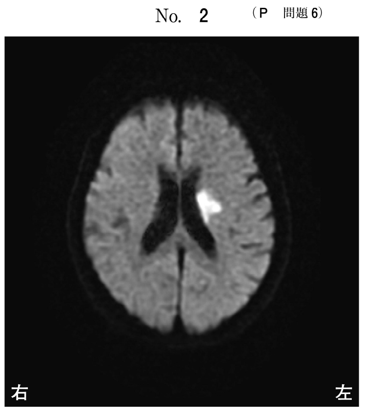 75歳の女性。右利き。脳梗塞を発症し救急車で搬入された。発症翌日に症状の悪化を認めた。発症3日目の頭部MRIの拡散強調像(別冊No.2)を別に示す。