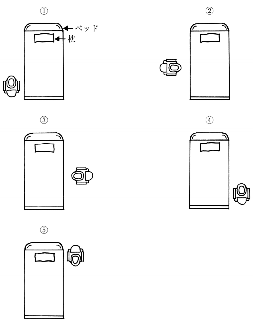 トップ 医療・介護・福祉に関する資格 理学療法士 平成30年度 第53回 過去問(2018年度) 問16 全部で185問 挑戦中 午前 問題 脳卒中後の左片麻痺患者の生活環境を整えることとした。ベッドとポータブルトイレの位置で適切なのはどれか。 (1) ① ② ③ ④ ⑤ 次の問題へ