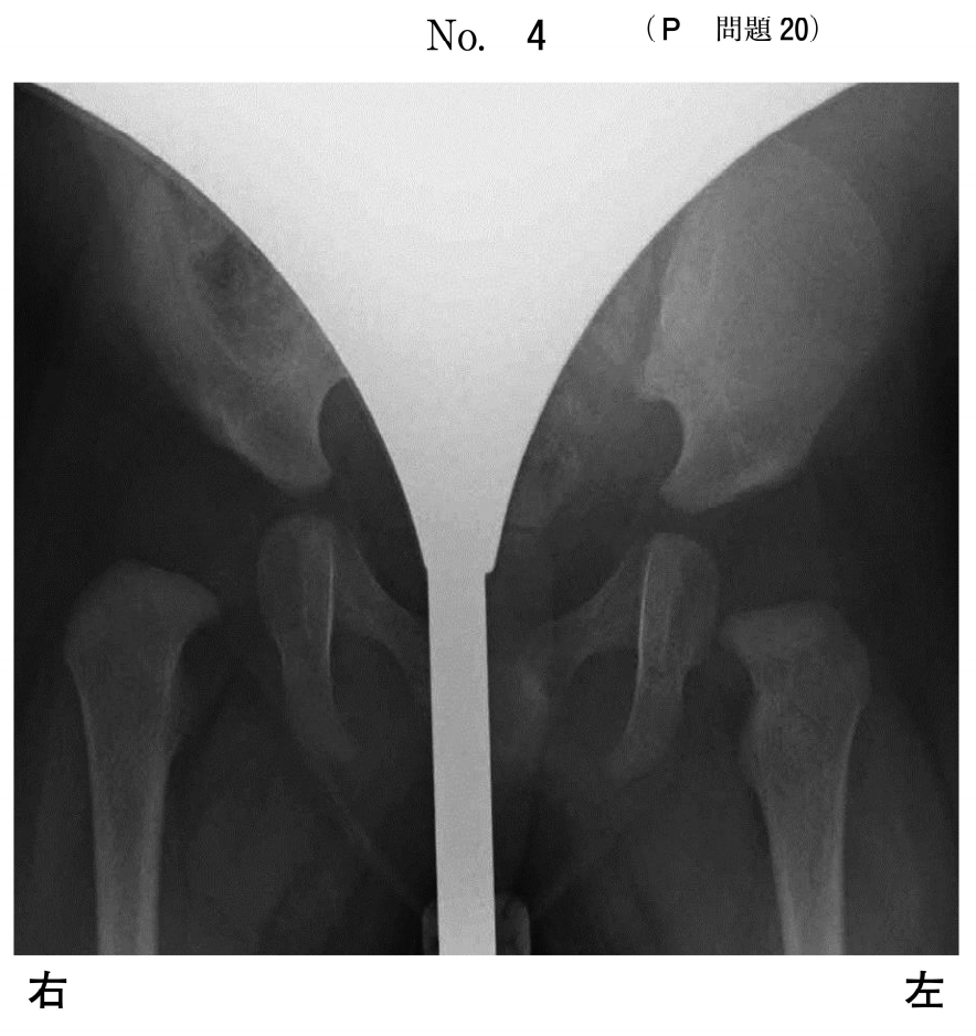 生後4か月の乳児。健診で股関節の異常を指摘された。来院時に右股関節の開排制限を認めたため、股関節の工ックス線単純検査を行った。