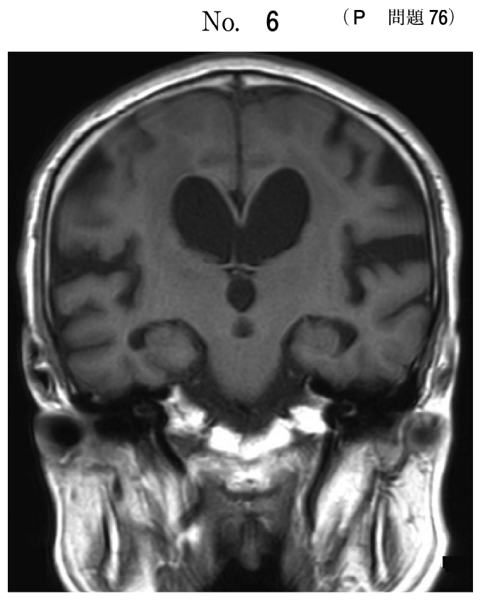 歩行障害がある患者の頭部MRIのT1強調冠状断像(別冊No.6)を別に示す。腰椎穿刺を行い髄液を排出させたところ、歩行障害が改善した。最も考えられるのはどれか。