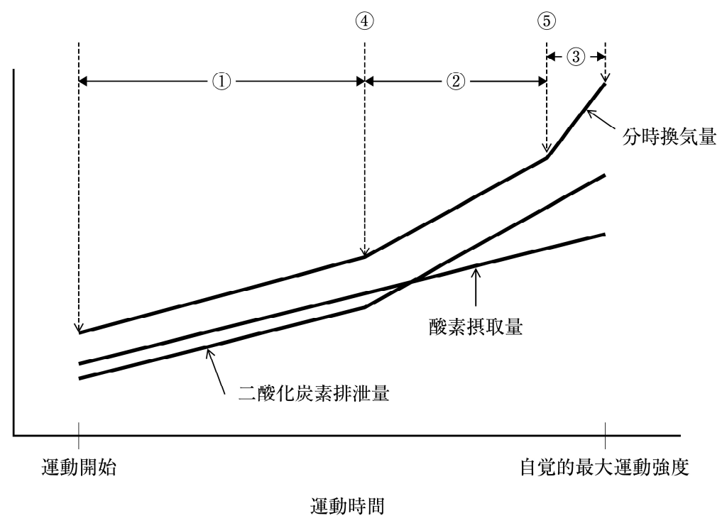 20歳の男性。自転車工ルゴメータ一を用いて、1分間に20ワット増加させるランプ負荷法にて心肺運動負荷試験を行った。その際の分時換気量、二酸化炭素排泄量および酸素摂取量の変化を図に示す。