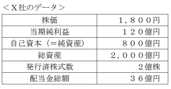 下記<X社のデータ>に基づき算出されるX社の株式指標に関する次の記述のうち、誤っているものはどれか。