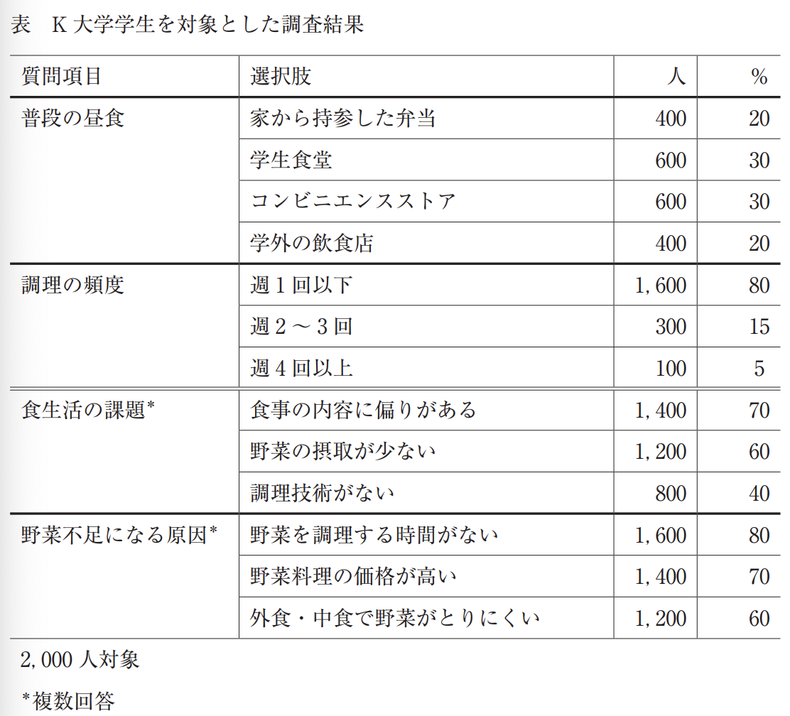 K大学に勤務する管理栄養士の資格を持つ教員である。学生支援部から学生の食生活改善のための事業を依頼された。学生の食生活調査の結果、男女とも野菜の摂取量が少なかった。そこで、学生を対象に、野菜摂取量の増加を目標に取組を行うことになった。表は、K大学学生を対象とした調査結果の一部である。