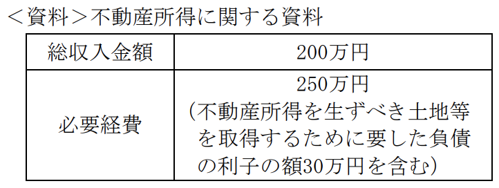 下記の<資料>において、所得税における不動産所得の金額の計算上生じた損失の金額のうち、他の所得の金額と損益通算が可能な金額は、( )である。