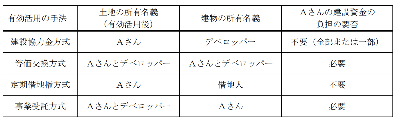 Aさんは、商業用店舗の建設等を通じた所有土地の有効活用について検討している。土地の有効活用の手法の一般的な特徴についてまとめた下表のうち、各項目に記載された内容が最も適切なものはどれか。