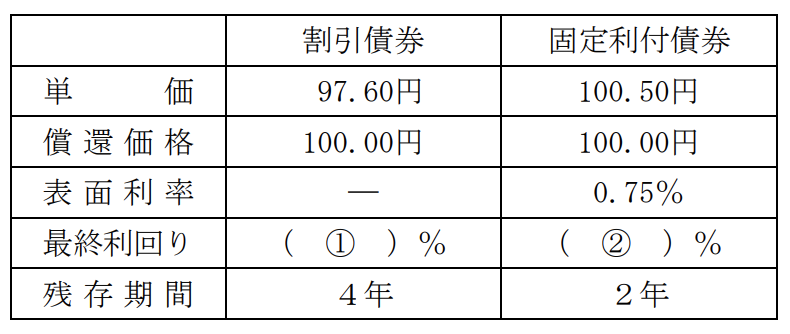 以下の表に記載されている割引債券の1年複利計算による最終利回り(空欄①)と固定利付債券の単利計算による最終利回り(空欄②)の組合せとして、次のうち最も適切なものはどれか。なお、税金や手数料等は考慮せず、計算結果は表示単位の小数点以下第3位を四捨五入すること。