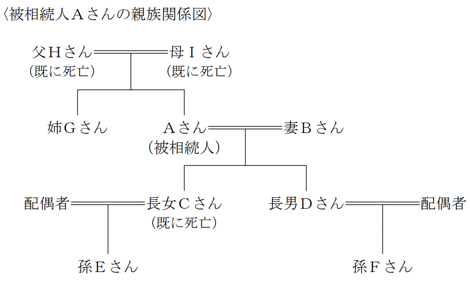 2020年12月に死亡したAさんの下記の親族関係図に基づき、民法上の相続人等に関する次の記述のうち、最も適切なものはどれか。なお、父Hさん、母Iさんおよび長女CさんはAさんの相続開始前に死亡している。また、妻Bさん、長男Dさん、孫Eさん、孫Fさんおよび姉Gさんは、いずれもAさんから相続または遺贈により財産を取得し、相続税額が算出されるものとし、Aさんから生前に贈与を受けた財産はないものとする。