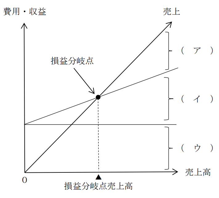 損益分岐点比率に関する次のグラフおよび記述の空欄(ア)~(エ)にあてはまる語句の組み合わせとして、最も適切なものはどれか。