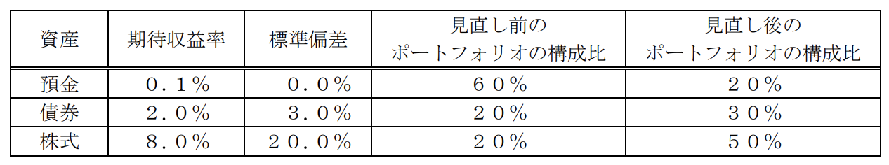 Aさんは、預金、債券、株式でポートフォリオを組んだが、その後各資産の構成比の見直しを行った。Aさんのポートフォリオが下表のとおりであった場合、Aさんの見直し前のポートフォリオの期待収益率と見直し後のポートフォリオの期待収益率の差(見直し後の期待収益率-見直し前の期待収益率)として、最も適切なものはどれか。