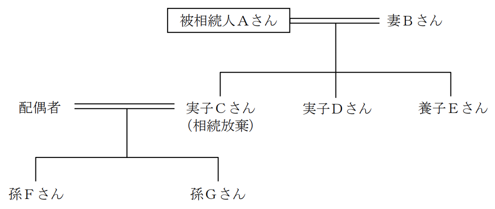 下記<親族関係図>において、Aさんの相続が開始した場合の相続税額の計算における遺産に係る基礎控除額として、最も適切なものはどれか。なお、Cさんは相続の放棄をしている。また、Eさんは、Aさんの普通養子(特別養子縁組以外の縁組による養子)である。