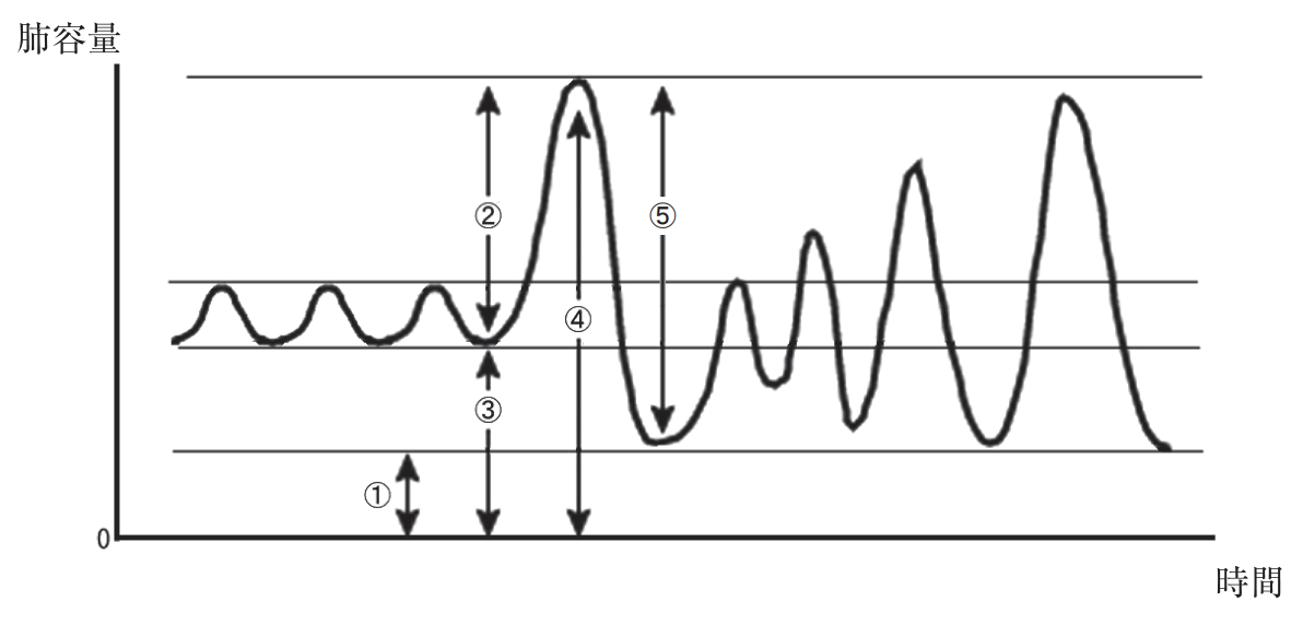 「安静時呼吸」、「深呼吸」、「徐々に深くなっていく呼吸」に伴う肺容量の変化を図に示す。