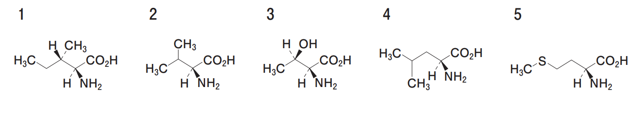 日本薬局方収載医薬品の化学名(2S)-2-Amino-4-methylpentanoic acidに対し、正しい構造式はどれか。1つ選べ。