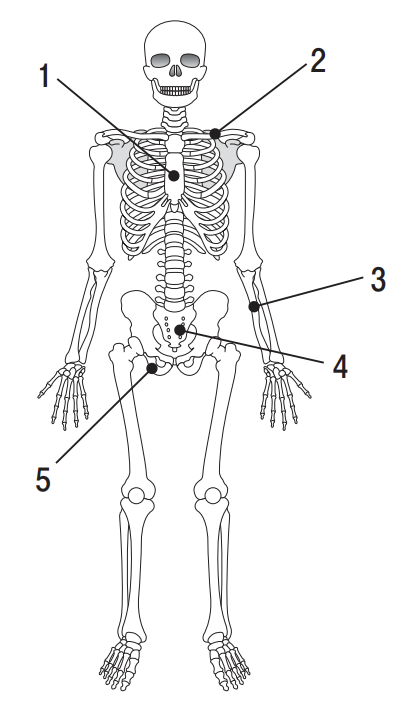 下図は、人体骨格の模式図である。1~5のうち、仙骨はどれか。1つ選べ。