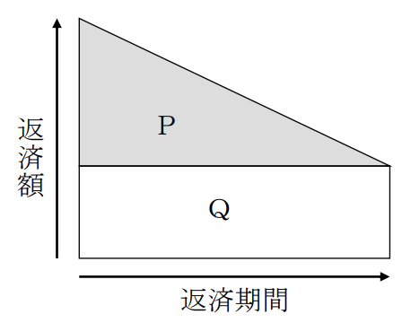 下図は、住宅ローンの( ① )返済方式をイメージ図で表したものであり、図中のPの部分は( ② )部分を、Qの部分は( ③ )部分を示している。