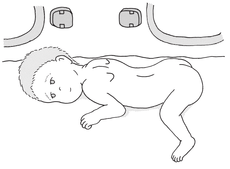 NICUに入院中の低出生体重児。在胎週数30週。腹臥位での姿勢を図に示す。