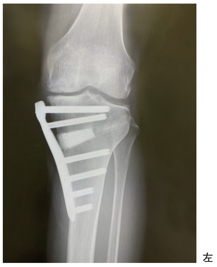 55歳の女性。趣味でジョギングを行っている。変形性膝関節症に対して手術療法が行われた。術後のエックス線写真を別に示す。