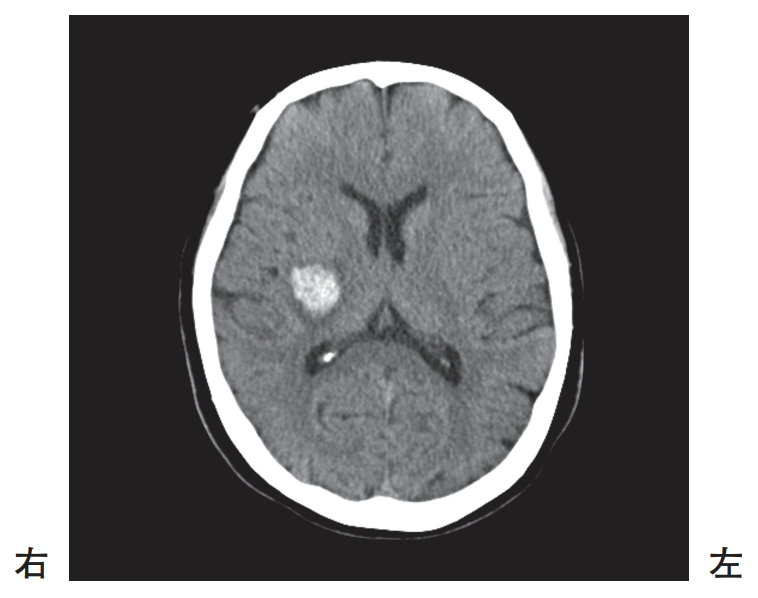 65歳の男性。入浴中、軽度の意識障害および左片麻痺が突然出現したため救急車で搬送された。救急外来到着時の頭部単純CTを別に示す。
