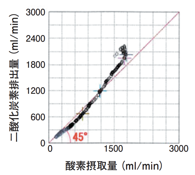 73歳の男性。身長170cm、体重55kg。糖尿病でインスリン治療導入中。運動強度の決定のため自転車エルゴメーターを用いて、1分間に20Watts増加させるランプ負荷法で心肺運動負荷試験を行った。二酸化炭素排出量および酸素摂取量の変化のグラフを別に示す。