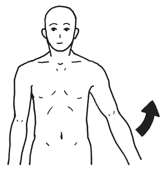 関節可動域測定法(日本整形外科学会、日本リハビリテーション医学会基準1995年)に従って図のように肩関節の可動域を測定する。
