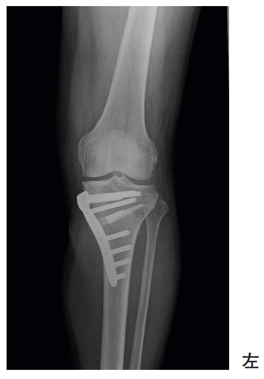 60歳の男性。内側型の変形性膝関節症に対して手術療法が行われた。術後のエックス線写真を別に示す。