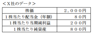 トップ FPファイナンシャルプランナーに関する資格 FP2級 学科 ファイナンシャルプランナー AFP[解説付き] 2017年(平成29年)1月 過去問[解説付き] 問0 全部で36問 挑戦中 金融資産運用 問題 下記<X社のデータ>に基づき算出されるX社の株式指標に関する次の記述のうち、最も不適切なものはどれか。 (1) PBR(株価純資産倍率)は、2.5倍である。 適切。PBR=株価2000円÷1株当たり純資産800円=2.5倍 PER(株価収益率)は、10倍である。 適切。PER=株価2000円÷1株当たり当期純利益200円=10倍 ROE(自己資本利益率)は、25%である。 適切。ROE=当期純利益200円÷純資産800円×100=25% 配当利回りは、10%である。 不適切。配当利回り=1株当たり配当金80円÷株価2000円×100=4% 次の問題へ
