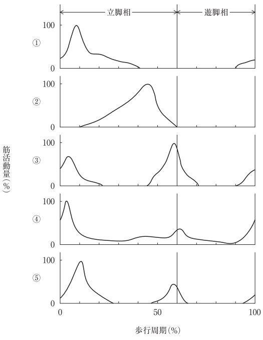 トップ 医療・介護・福祉に関する資格 理学療法士 平成29年度 第52回 過去問(2017年度) 問0 全部で100問 挑戦中 午後 問題 健常成人の平地歩行時の下肢筋活動を図に示す。 下腿三頭筋の筋活動に相当するのはどれか。 (1) ① ② ③ ④ ⑤ 次の問題へ