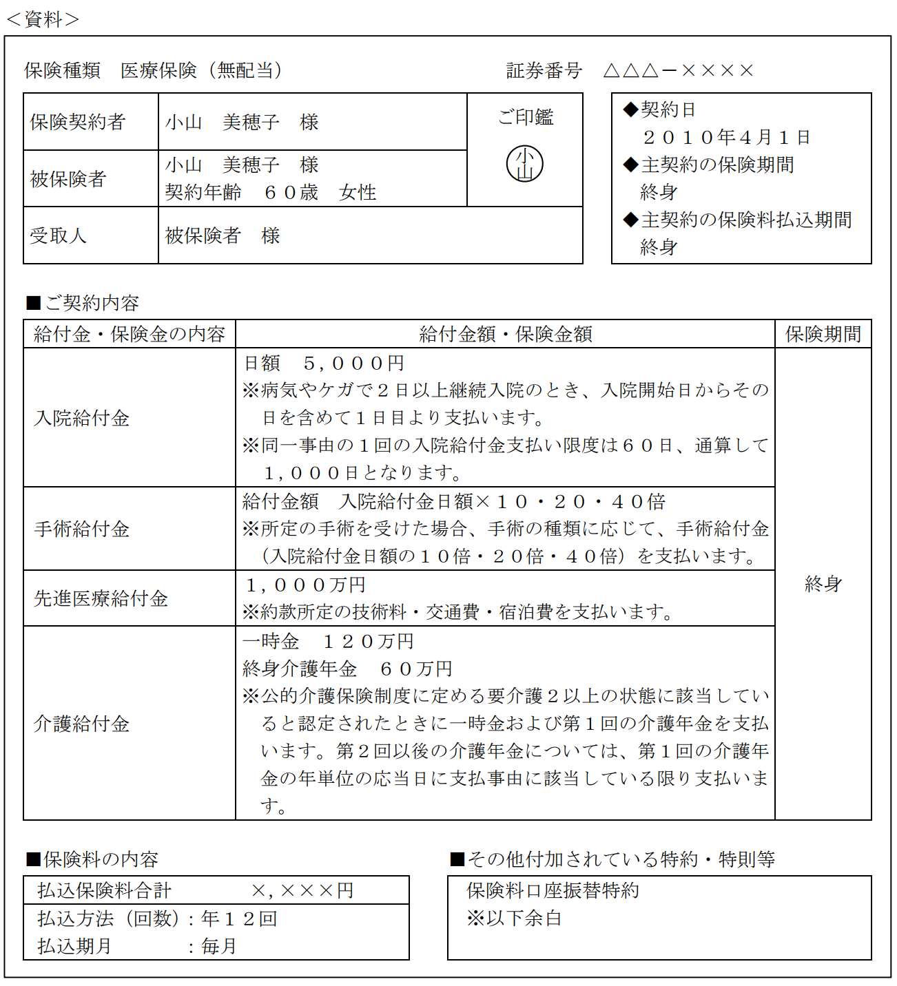 小山美穂子さんが加入している医療保険(下記<資料>参照)の保障内容に関する次の記述の空欄(ア)にあてはまる金額として、正しいものはどれか。なお、保険契約は有効に継続しているものとし、美穂子さんはこれまでに<資料>の保険から保険金および給付金を一度も受け取っていないものとする。