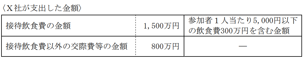 期末の資本金の額が1億5,000万円であるX株式会社(1年決算法人。以下、「X社」という)は、平成28年4月1日に開始する事業年度において下記の交際費等を損金経理により支出した。次のうち、X社の法人税の計算における交際費等の損金不算入額として、最も適切なものはどれか。なお、接待飲食費は、得意先との会食によるもので、専ら社内の者同士で行うものは含まれておらず、所定の事項を記載した書類も保存されているものとする。