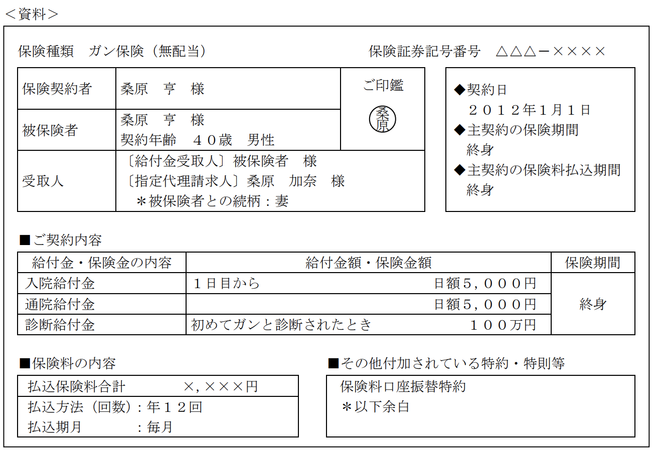 桑原亨さんが加入しているガン保険(下記<資料>参照)の保障内容に関する次の記述の空欄(ア)にあてはまる金額として、正しいものはどれか。なお、保険契約は有効に継続しているものとし、亨さんはこれまでに<資料>の保険から保険金および給付金を一度も受け取っていないものとする。